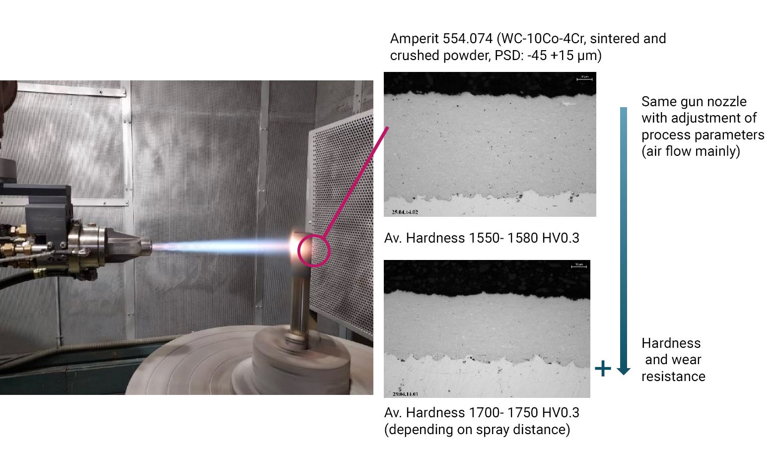 - HVOAF: condiciones de llama supersónica en amplio rango de temperaturas, lo que resulta en un proceso altamente flexible, apto para el procesamiento de materiales clásicos hasta materiales sensibles a la temperatura.